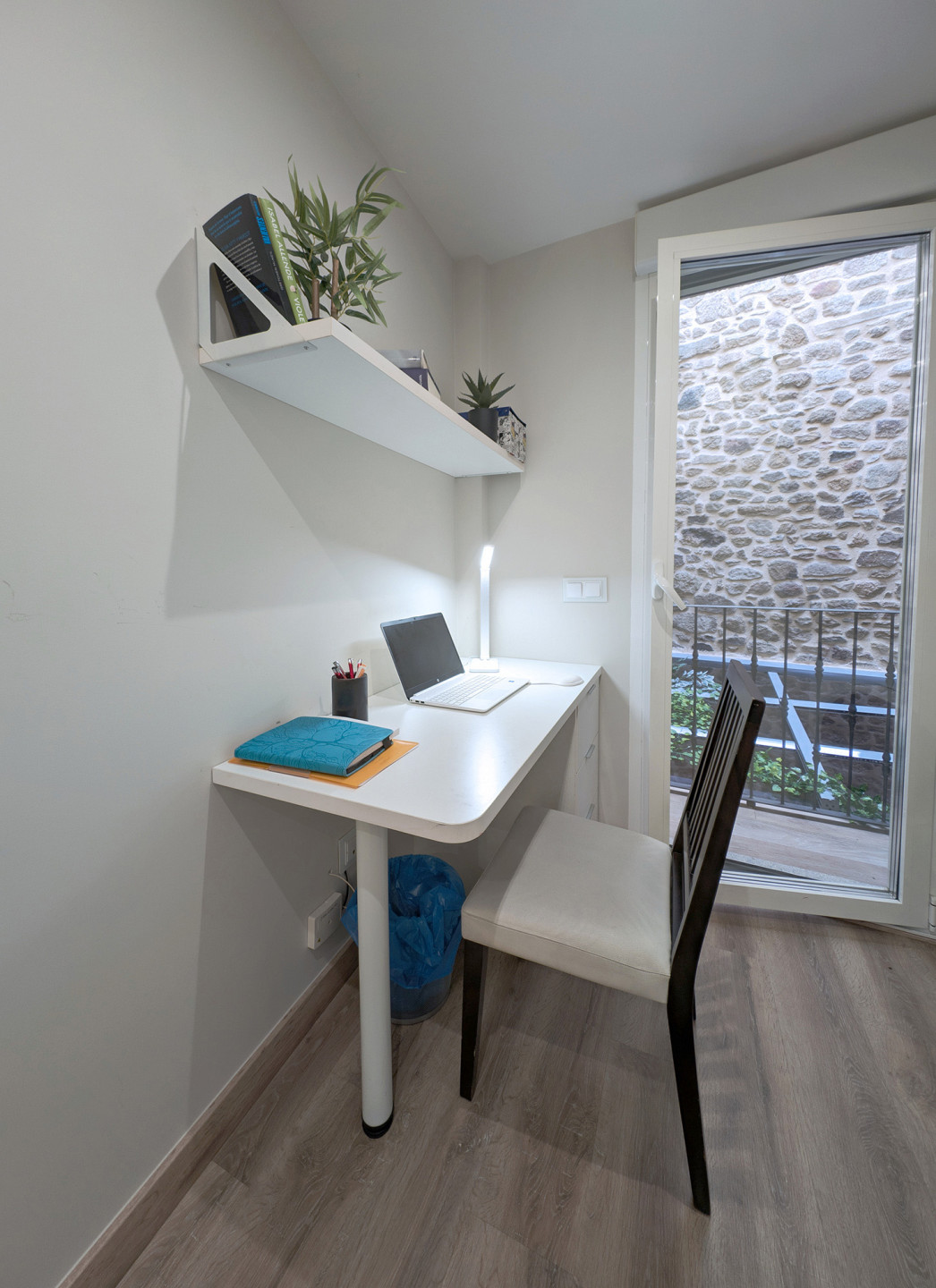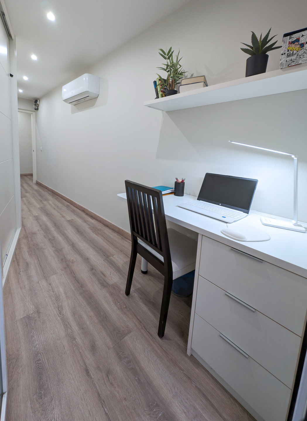 Master bedroom and studyThe first floor is designed for rest and comfort. Here you will find one of the main bedrooms with a king-size bed, a full bathroom with shower, a study, and an interior terrace overlooking the patio – perfect for relaxing and enjoying the calm of the surroundings.